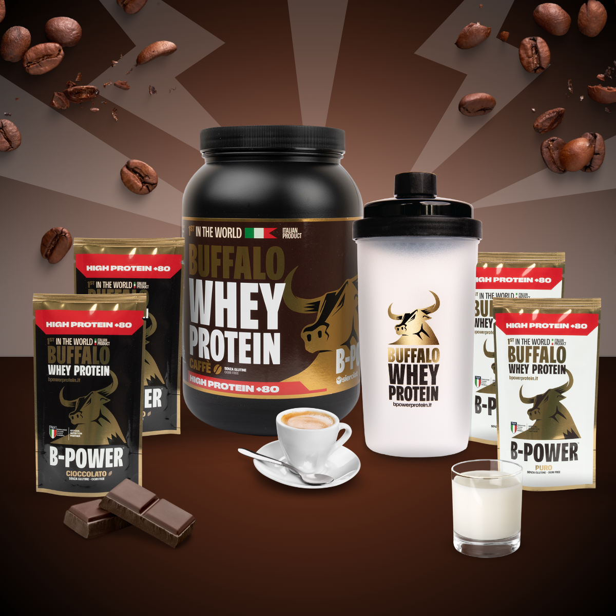 Promo Box Coffee +80 Buffalo Whey - 1kg Protein Powder Jar + Free 1 Shaker, 2 Chocolate Sachets and 2 Pure