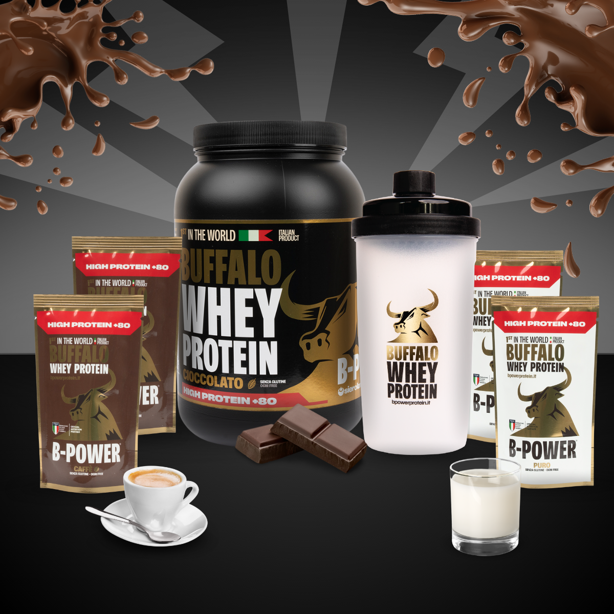 Chocolate Promo Box +80 Buffalo Whey - 1kg Protein Powder Jar + Free 1 Shaker, 2 Coffee Sachets and 2 Pure